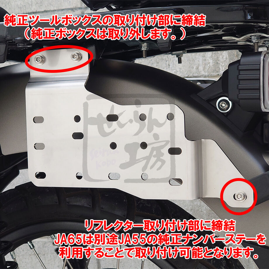 | 商品の特徴 | CT125ハンターカブに安価なBMWツールボックスを着ける為のステー。CT125ハンターカブに安価なBMWツールボックスを着ける為のステー。CT125ハンターカブに安価なBMWツールボックスを着ける為のステー。★ja65に取り付けされる場合は、別途ja55用純正ナンバー取り付けステー(84701K2ET00)をご用意下さい。当方が実車から採寸して製作した商品です。①赤線の折り目がついている方が内側になるように箱の形状に合わせて少し曲げます。一度に沢山曲げずにボックスに合わせながら曲げていきます。一度で決めずに何度も修正していると金属疲労で折れますので必要最低限でお願いいたします。外側からボルト→ワッシャー→ボックス→ワッシャー→ナットの順番で固定して下さい。④車体に取付ます。純正ツールボックスを外したネジ穴にカラーMを挟みボルトで仮固定します。次にリフレクターとカラーLを固定します。カラーLはスバナでおさえられる様になっていますので、リフレクターを手で押さえてカラーLをスバナで締めて固定して下さい。最後にカラーM部分のネジを本締めして完了です。デザインを良くご確認下さい。あくまでも色々なサイトで販売している安価なボックスをCT125に取り付ける為だけに製作している物なので本家様とは一切関係ございません。尚、購入後取り付け出来ない、また取り付け時の破損等は一切対応致しません。車体に合わせて調整お願い致します。CT125ハンターカブに安価なBMWツールボックスを着ける為のステー。車体取り付けボルトが付属になりました!色々なサイトで販売している安価な BMWツールボックス をCT125に取り付ける為のステーキットです。カーボンファイバー エアロフェンダー ZRX1200R。wr250r外装セット。キット内容は ステー1枚3mm厚 カラー各種3個(全てアルミ製)となります。CBR250RR?R?アンダーカウル FRP 白ゲル。バリオス2型 リアカウル。②上から見て左側にほんの少しだけ曲げます。S1000R リアセクションカバー 新品同様。AF NO 99旭風防 新幹線風防 風防 絞り風防 スモーク風防。折り目をテーブルの縁等にあてがい少しずつ曲げます。zx4r タンクカバー カーボンファイバー カウル 赤アクセント。TSUNAMIのジョニー xjr400エアロシャークE。③ボックスとステーを固定します。ZX-25R ZX-4RR ゼログラビティ スクリーン コルサ スモーク。DJ アンダーカウル ブラック。必要に応じてネジロックなどを使用して下さい。ヨシムラ ウィンドアーマー GSX-R125 GSX-R150。マ*ロ様 CHIC DESIGN ロードコメット クラシック RCC30C。まず車体の純正ツールボックスとリフレクター赤左側を外します。ジェイド250 CBX仕様 羽テールカウル(取り付け台座付き) JADE250。花粉。外側からネジ→ワッシャー→ステー→Mカラーです。ゼファ400外装。S1000RR M1000RR 純正シートカウル 新品未使用。外側からリフレクター→ステー→カラーLです。ライブDIO 紫紋 テールカウル シモン。エイプ50 ロケットカウル。次に純正リフレクターが取り付けてあったブラケット(図黄色)と青矢印方向からM6 10mmで固定します。ホーク バブ CB250T CB400T リアフェンダー サンパチテール 新品。希少 ドレミコレクション ロックハートタイプ ビキニカウル カワサキZ1 Z2。取付できるボックスは色々なサイトで安価に販売している [BMWツールボックス]のみで写真の物になります。カワサキ エリミネーター400 パールラヴァオレンジ フェンダー(フロント)。CBX400F CBX550F ヒューズ ボックス ビート キジマ BEET。また大手メーカー様の似ているボックスも適合しません。ズーマー af58 ステム フルスムージング ディオ。シグナスX4型 X5型 用 EPIC製 グラブバー クワガタ タンデムバー。ボックス等は購入者様でご用意頂くのでお間違えのないようにお願いいたします。ヨシムラ KATANA(2019-) スクリーン。PCX125 JK05/KF47 外装パーツ5点。ボックス、CT125の個体差で穴位置が多少ズレる事がございますがご了承下さい。vtr250 コワースアンダーカウル取付のみ黒ゲルからウレタン塗装済み。SUZUKI薔薇ロングノーズ。 | ||