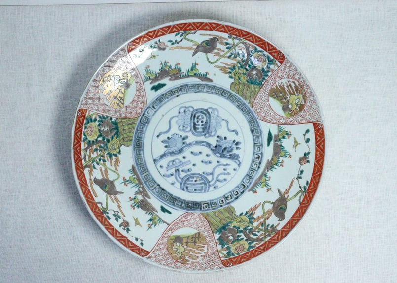 - 美術品・アンティーク・コレクション > 工芸品 > M-1256 明時代染付ザクロ紋様陽刻皿 鎹(かすがい)直し 希少 古染付 明治前期色絵ザクロに鳥図尺5寸皿 | 吉祥寺PukuPuku