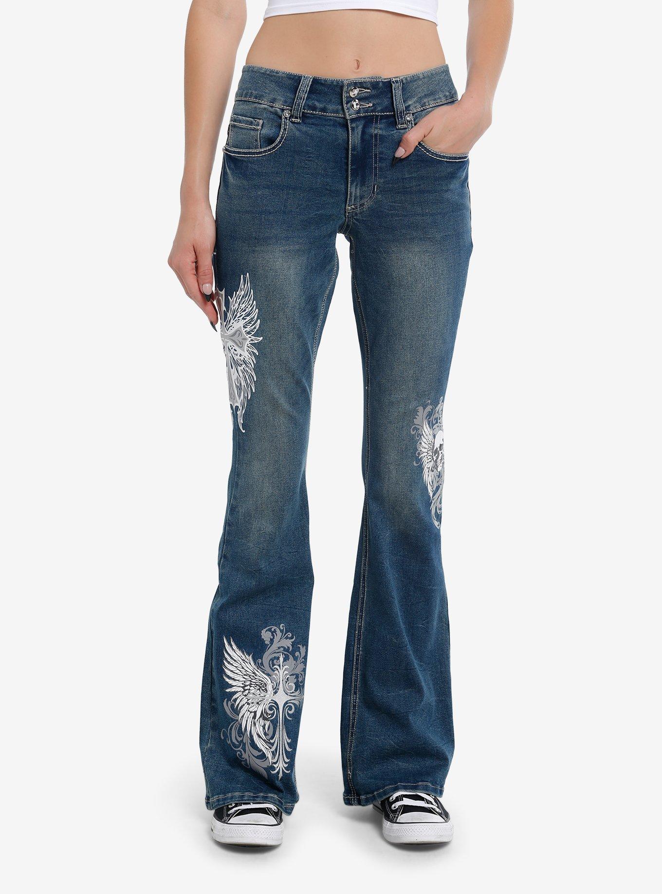 パンツ Jent Louis Bicolor Semi-Flare Denim Cross Skull Wings Rhinestone Flare Denim Pants | Hot Topic