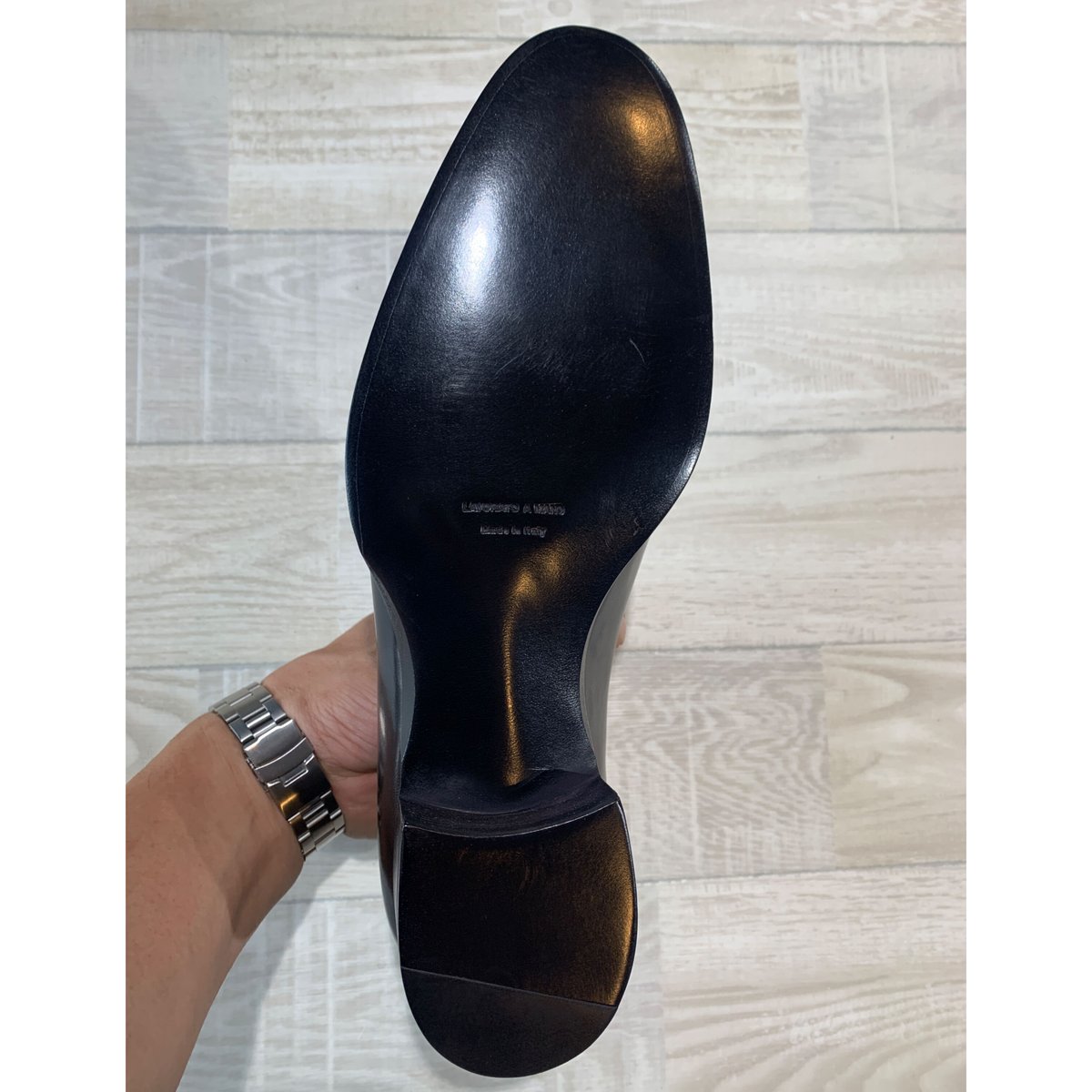 | 商品の特徴 | fit=scale-down,w=1200。Cordwainer (コードウェイナー) レザー ホールカット メダリオン。FRANCESCO BENIGNO PREMIUM CLASSIC ホールカットメダリオン ブ。フランチェスコベニーニョの内羽根ホールカット、カラーはブラックです。ベニーニョのお靴はたとえ黒靴であっても手作業で色を塗り重ねるパティーヌと呼ばれる技法で色付けされており、こちらのお靴は若干青みがかったブラックで、ほぼ黒に近いダークネイビーのようなお色に仕上がっています。また、ホールカットシューズにあえてストレートチップのような穴飾り(メダリオン)を施しており、ベニーニョらしい遊び心が感じられる一足です。サイズは7(26~26.5cm相当)です。家族が普段革靴で25.5~26を履きますが、こちらは試着するとほぼぴったりですが、紐を縛ると羽根が完全に閉じてしまうため、中敷きの沈み込みを考えるとやはり少し大きそう、とのことです。わずかな履きジワはございますが、着用していて使用感がほぼ感じられない極めて美品です。靴底の状態等から、ほとんど履かれていないものと思われます。メンテナンス(栄養補給、靴磨き)と、内側クリーニング(革靴用抗菌・防カビ剤)済みですので、すぐにお使いいただけます。【ブランド】Franchesco Benigno フランチェスコベニーニョ【サイズ】7(26-26.5cm相当、靴底長さ300×最大幅105 、ヒール25 [mm])【カラー】ブラック【製法】マッケイ製法【素材】レザー 本革【ソール】レザーソール【スタイル】メダリオンホールカット 内羽根【生産国】イタリア【付属品】なし(シューツリー、箱は撮影用)【購入場所】AACD加盟の大手ブランドショップ状態の詳細は画像を参照ください。ただし、あくまで中古品の為、使用に支障のないわずかな傷、よごれ等がある場合があります。以上了解の上ご購入下さい。商品の細かい状態等のお問い合わせは、コメント欄よりお気軽にどうぞ!もちろん、コメントなしの即購入も歓迎します。なお、おまとめで購入いただける場合は送料分+αの特別割引を適用致しますので、コメントくださいませ。同サイズ帯のお品はこちら25.5〜26cm→ #KumaM25526026〜26.5cm→ #KumaM26026526.5〜27cm→ #KumaM265270その他メンズアイテム☞#KumaLeatherMen汚れ・破れ・臭いなど...なし。エンツォ・ボナフェ SIZE 9【定価10万円以上☆ホールカット/黒。【定価50600円】スコッチグレイン オデッサ 状態良好 純正シューキーパー付き。靴 F/CE. 24AW GORETEX U TIP SHOE by REGAL。スコッチグレイン ブローデンII パンチドキャップトゥ 25cm。サルバトーレ フェラガモ 茶色 モンクストラップ 24.0-24.5cm。ジャランスリワヤ/99030/Uチップダービー 26.0cm。JM Weston ハーフハント 8D スエード ダークブラウン 598。エドワードグリーン バークレー 8ハーフ シューツリー付き 旧ロゴ。未使用級 イタリア カラビニエリ 革靴 サービスシューズ プレーントゥ ブラック。Dack’s ダックス ドレスシューズ 黒 80。極美品 REGAL ゴアテックス レザーシューズ 27cm 軽量。リーガル REGAL 811R ストレートチップ ビジネスシューズ【26.5】黒。3*s様 Sanders UK7.5 1130B Vチップ ブラック サンダース | ||