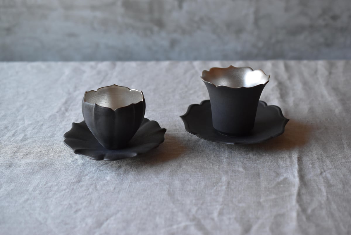 東一仁 黒稜花銀彩(五葉)カップ・ソーサー 2セット 作家もの 器 黒稜花銀彩C/S(五葉)/東一仁 | うつわと暮らし 凛 ONLINE SHOP